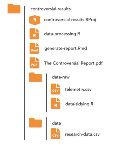 Above, we see an exceedingly clean R project. The folder is called ‘controversial-results’, and we can see it contains both the raw telemetry behind our research in a folder called ‘data-raw’, and a tidied form of the data in a folder called ‘data’. Then the process for data wrangling is kept within the ‘data-processing.R’ file, and finally, there’s an R markdown file ‘(.Rmd)’ which is used to generate ‘The Controversial Report.pdf’ which we communicate to others. Anyone can reproduce this analysis by simply obtaining the ‘controversial-results’ folder, opening up ‘controversial-results.RProj’ file in RStudio, and then running the ‘data-processing.R’ file. Finally, projects make collaboration much easier, because projects keep all your files together.
